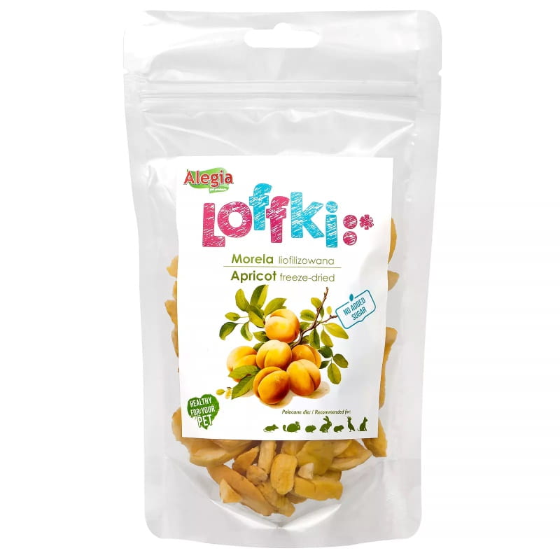 Alegia Loffki Morela Liofilizowana to w pełni naturalna przekąska dla gryzoni, królików, papug oraz gadów, przygotowana z najwyższej jakości owoców klasy human grade. Dzięki procesowi liofilizacji morele zachowują większość swoich cennych witamin, minerałów i naturalnego aromatu, pozostając lekkostrawną i niskokaloryczną formą urozmaicenia diety. Bogactwo błonnika wspiera prawidłową pracę jelit, a obecność witamin A, C i E oraz potasu korzystnie wpływa na funkcjonowanie wzroku, odporności i układu krwionośnego. Morele są również źródłem silnych przeciwutleniaczy, takich jak beta-karoten i zeaksantyna, które pomagają neutralizować wolne rodniki.