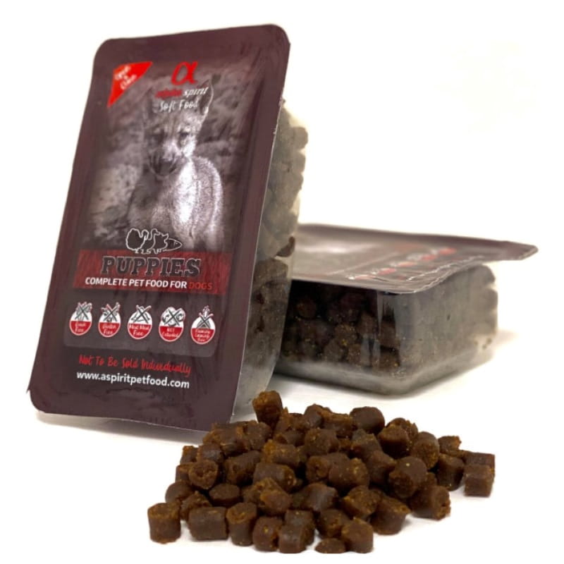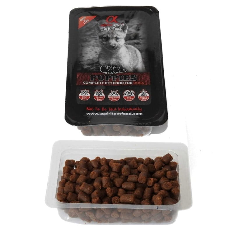 Alpha Spirit Puppies to pełnoporcjowa karma półwilgotna (200g). Produkt w 100% naturalny, pakowany w pojedyncze, szczelnie zamknięte tacki: