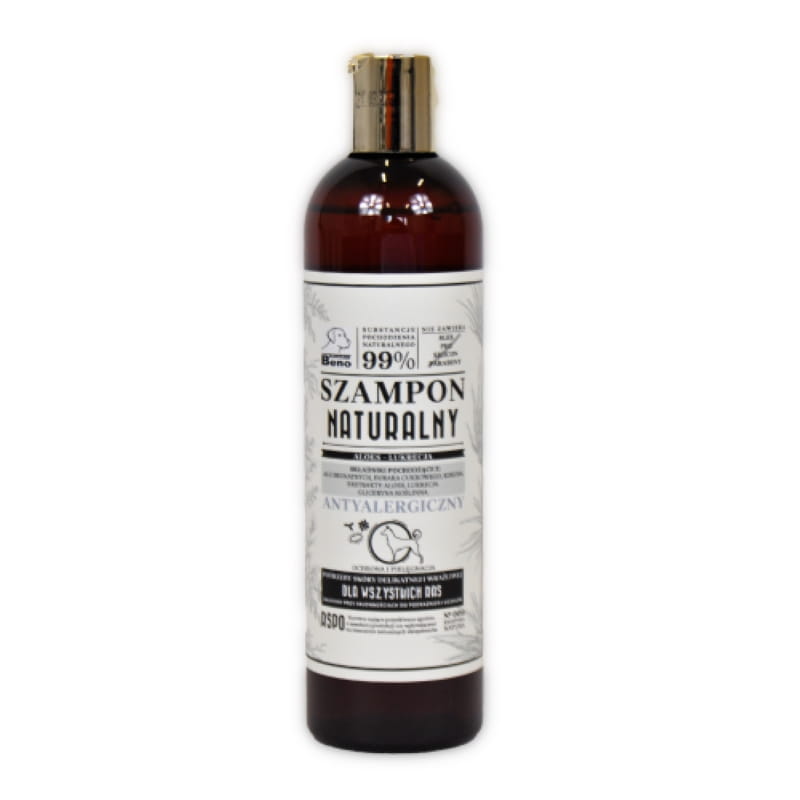 Super Beno naturalny szampon antyalergiczny. Zastosowane składniki myjące są pozyskiwane z surowców naturalnych, roślinnych i cechuje je łagodność dla skóry zwierząt. Mają silne właściwości nawilżające i nie podrażniają skóry.