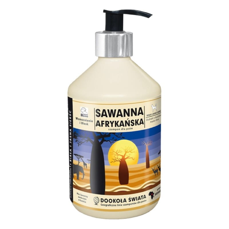 Beno szampon Sawanna Afrykańska do białej i jasnej sierści - delikatny, dla psów o jasnej i białej sierści, skutecznie oczyszcza oraz nawilża włos. Zawiera ekstrakt z baobabu, wspierający regenerację i ochronę przed czynnikami zewnętrznymi.