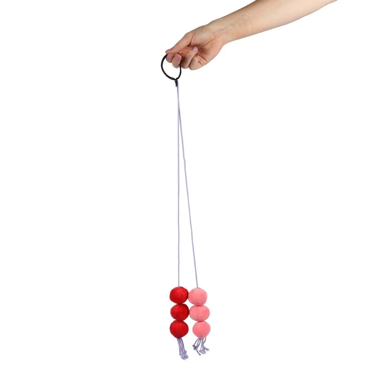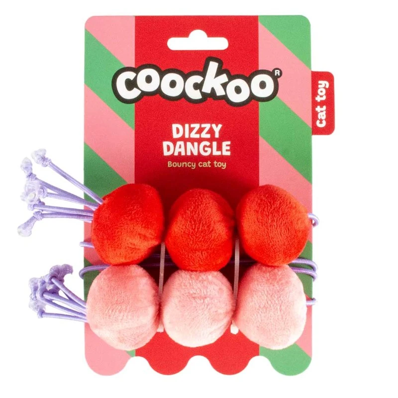 COOCKOO DIZZY DANGLE to elastyczna zabawka dla kota z miękkimi kulkami i dzwoneczkami, idealna do montowania na drapaku, klamce lub do zabawy w dłoni. Zachęca do ruchu i pobudza naturalne instynkty kota.