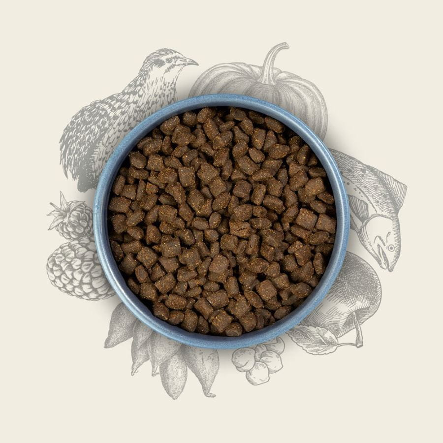 26% suszony łosoś, 21% przepiórka (mrożona), gliceryna roślinna, słodkie ziemniaki, 6% tłuszcz wieprzowy, 5% dziczyzna (mrożona), lucerna, 2% wątróbka wieprzowa (mrożona), tapioka, ciecierzyca, dynia, jabłko, jeżyna, seler, cykoria, 0,03% glukozamina, 0,033% metylosulfonylometan (MSM), 0,02% siarczan chondroityny
