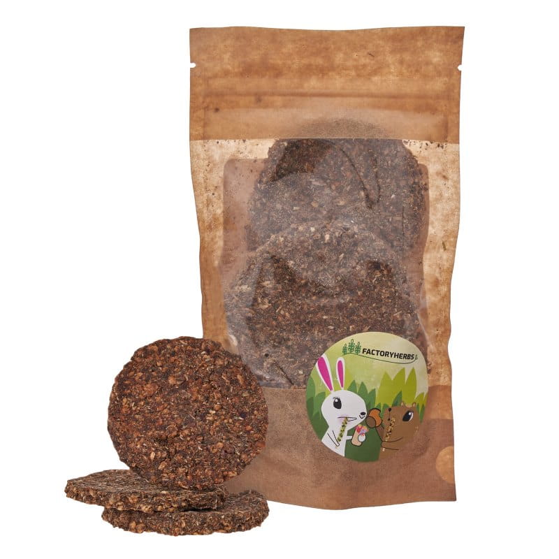 FACTORYHERBS Ciasteczka z pasternaku i babki lancetowatej z siemieniem lnianym to naturalna przekąska uzupełniająca dietę królików i gryzoni. Dostarcza wartości odżywcze i wspiera pracę układu pokarmowego.