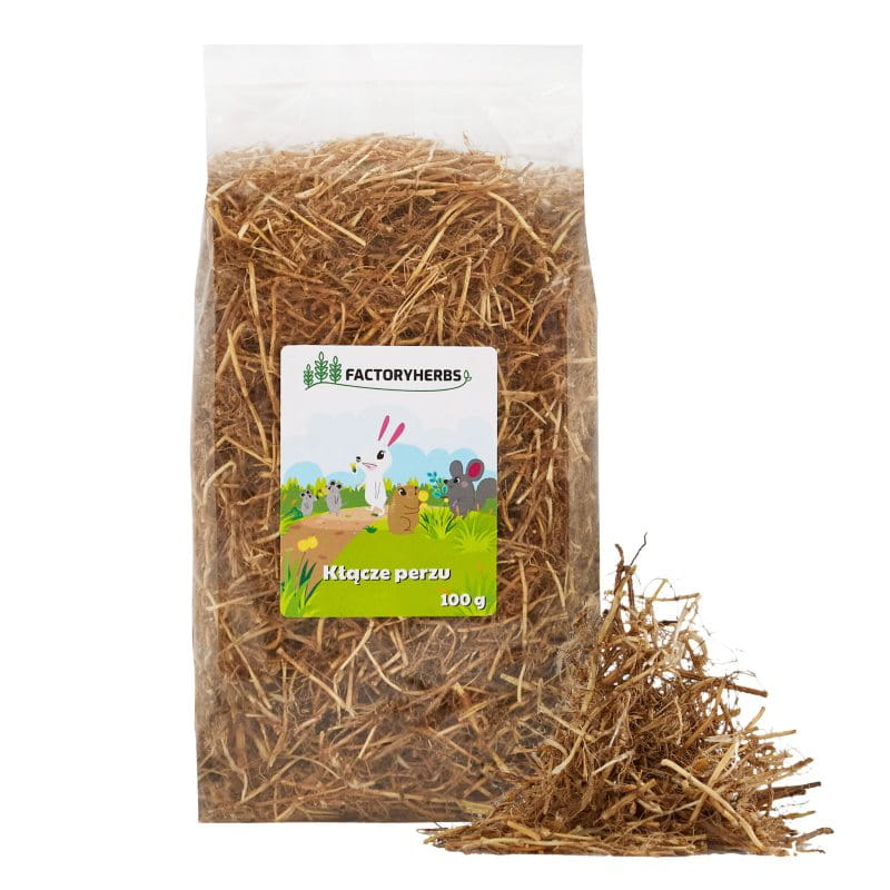 FACTORYHERBS Kłącze perzu to naturalny dodatek do diety królików i gryzoni, wspierający układ moczowy i odporność. Produkt jest w 100% naturalny i pakowany ręcznie.