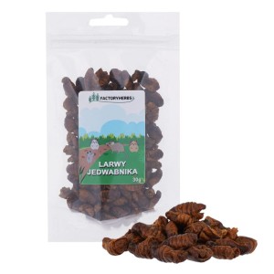 FACTORYHERBS Larwy jedwabnika to naturalny, bogaty w białko dodatek żywieniowy dla zwierząt owadożernych. Idealnie uzupełniają dietę chomików, myszy, myszoskoczków i szczurów.