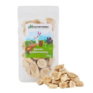 FACTORYHERBS Liofilizowane banany to naturalna owocowa przekąska dla królików i gryzoni, bogata w potas i błonnik. Lekka forma liofilizacji pozwala zachować walory świeżych owoców, czyniąc przysmak zdrowym i aromatycznym.