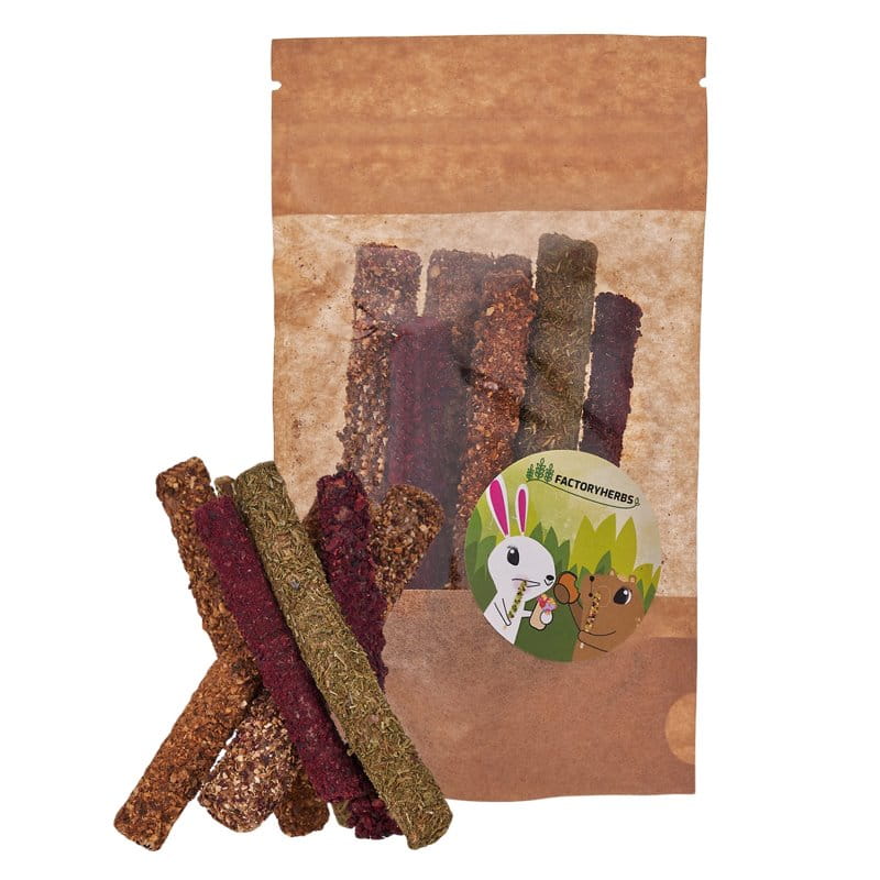 FACTORYHERBS Paluszki ziołowo-warzywne to naturalne gryzaki dla królików i gryzoni, wzbogacone suszonymi warzywami i ziołami. Wspierają ścieranie zębów i stanowią zdrowe uzupełnienie codziennej diety.