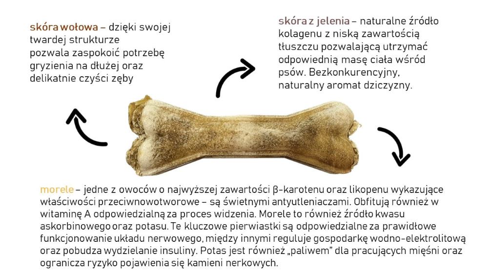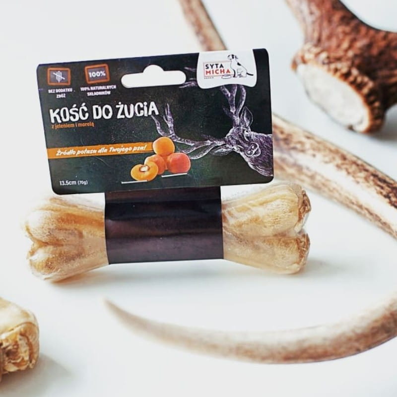 Kość do żucia Syta Micha to pyszne i zdrowe smakołyki, alternatywa dla popularnych gryzaków. Formuła z jeleniem i morelą stanowi odżywczą alternatywą dla popularnych gryzaków: