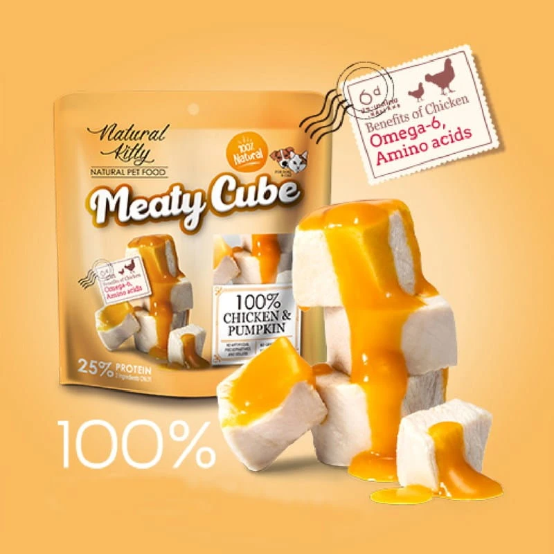 Natural Kitty Meaty Cube to smaczna przekąska zarówno dla psów, jak i kotów. Przysmak zawiera 100% kurczaka i dyni, które są gotowane na parze w celu wzmocnienia smaku i aromatu korzystnego dla zwierząt domowych. W taki sposób przyrządzany przysmak, nie traci swoich wartości odżywczych i witamin. To najlepsza codzienna nagroda dla Twoich zwierząt.