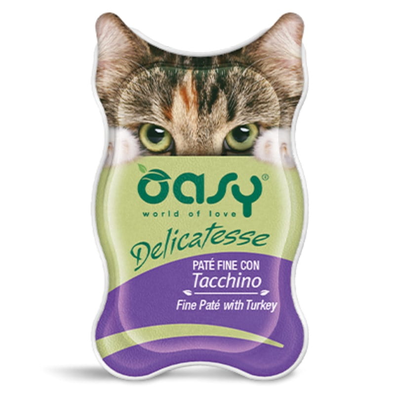 Oasy Delicatesse Fine Paté with Turkey - pasztet z mięsem indyka jako kompletna karma dla kotów dorosłych. Delicatesse Fine Paté to linia wysokiej jakości naturalnej karmy dla kotów. Wyrafinowany pasztet o delikatnej konsystencji dla pysznego posiłku. Przygotowana z dużą ilością mięsa i naturalnych składników, o delikatnej konsystencji, aby codziennie zapewniać pożywny i smaczny posiłek.