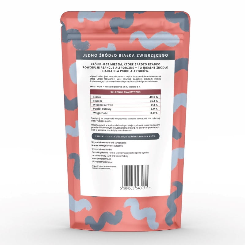Skład: królik, mięso mięśniowe 95%, tapioka 5%