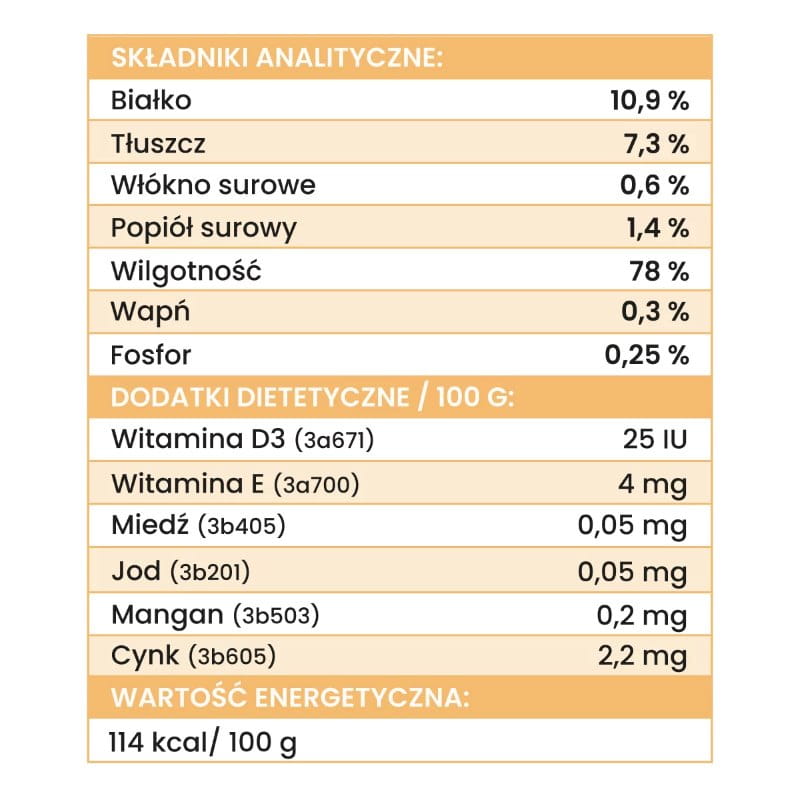 Skład analityczny: białko 10,9%, tłuszcz 7,3%, włókno surowe 0,6%, popiół surowy 1,4%, wilgotność 78%