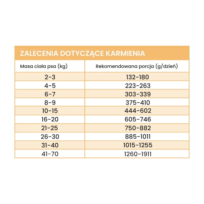 Pamiętaj, że zalecania żywieniowe mogą się różnić w zależności od wieku, kondycji i temperamentu psa. Należy zapewnić psu stały dostęp do świeżej wody do picia. Przechowywać w suchym i chłodnym miejscu. Podawać w temperaturze pokojowej. Po otwarciu przechowywać w lodówce nie dłużej niż 48 godzin.
