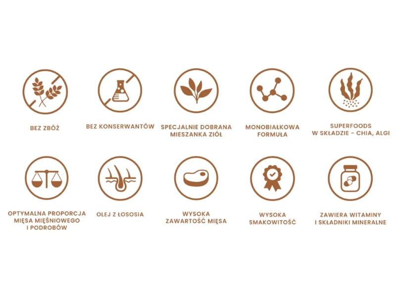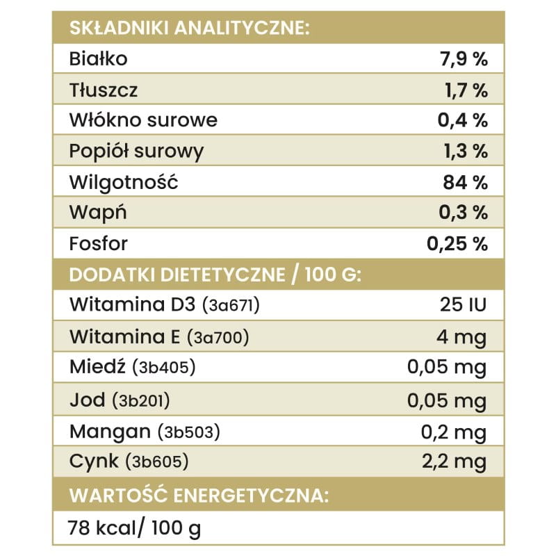Skład: kangur (88,75 %, w tym: 74,25 % mięso mięśniowe, 14,5 % podroby: żołądki, serca, wątroba), dynia (8 %), nasiona chia (1 %), witaminy i minerały (1 %), inulina (0, 65 %), algi morskie brunatne (0,24 %), olej z łososia (0,24 %), zioła (0,12 %, w tym: dzika róża, pokrzywa, jeżówka, kurkuma, ostropest plamisty). Wapń: 0,3% ; fosfor: 0,25%