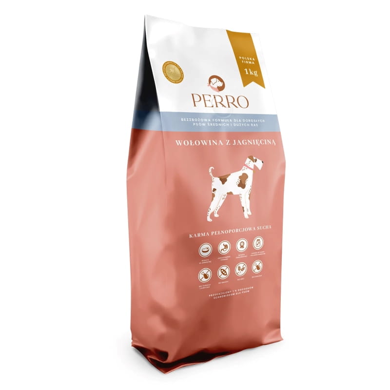 PERRO Wołowina z jagnięciną - pełnoporcjowa karma sucha dla psa. Karmy z wołowiną polecane są dla psów aktywnych. Jagnięcina charakteryzuje się niewielką zawartością tłuszczu, lekkostrawnością oraz wysoką smakowitością.