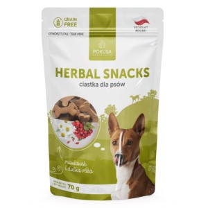 Pokusa Ciastka dla Psa – Ziołowe Przekąski Herbal Snacks to chrupiące, naturalne ciastka z dodatkiem dzikiej róży, czystka, pokrzywy i nagietka, wspierające odporność i trawienie psa. Bezzbożowe i handmade, idealne dla psów z wrażliwym układem pokarmowym.