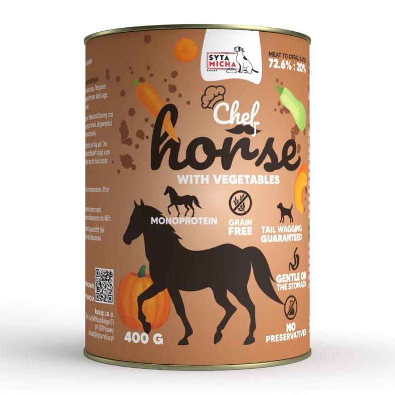 Syta Micha Chef Konina z warzywami to pełnoporcjowa, naturalna mokra karma dla dorosłych psów. Zawiera wysoką ilość mięsa koniny, wzbogacona warzywami i ziołami dla zdrowego trawienia.