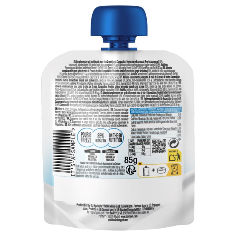 Skład: fermentowane produkty mleczne (jogurt bez laktozy) 90%, skrobia kukurydziana, indyk bez kości 3%, pektyna, fruktooligosacharydy 0,5%, Lacticaseibacillus casei (kapsułkowane nieaktywne bakterie) 0,04%, aromaty, witamina E (3a700) 200 j.m./kg, tauryna (3a370) 400 mg/kg, witamina D3 (3a671) 50 j.m./kg, kwas foliowy (3a316) 50 mg/kg